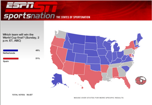 미국 스포츠 전문채널 <ESPN>은 2010 남아공 월드컵 결승전이 스페인과 네덜란드 간 매치로 확정되자 긴급 인터넷 설문조사를 실시했다. 미국은 상대적으로 축구 열기가 낮은 편이었으나, 메이저리그 축구(MLS)와 월드컵을 계기로 축구 열기가 서서히 퍼지는 나라다.