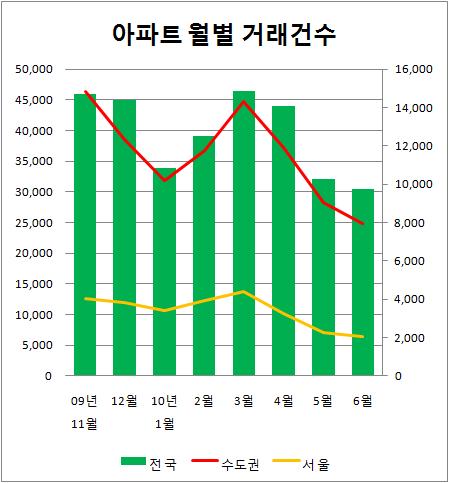 15일 국토해양부가 발표한 '6월 신고분 아파트 실거래가 자료'를 보면 지난달 전국 아파트 거래건수는 3만454건으로, 국제 금융위기 여파로 부동산 시장이 하락했던 작년 2월(2만8741건) 이후 가장 적었다.