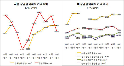 ▲이명박 정부 출범 후 전국 주요 아파트 가격 추이. 강남권(왼쪽) 아파트의 가격 변화폭이 비교적 컸으나 최근 들어서는 큰 변화조짐을 보이지 않고 있다. ⓒ프레시안