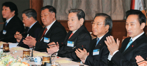 | ▲ 이명박 대통령이 전경련 초청 간담회에서 재벌 기업 총수들과 나란히 앉아 박수를 치고 있다. ⓒ뉴시스 |