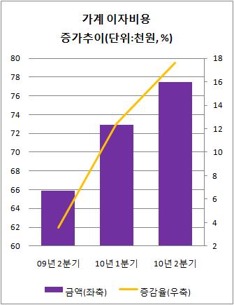 13일 통계청에 따르면 2분기 가계가 부담한 이자비용은 작년 동기보다 17.6%포인트 증가한 7만8000원으로 사상 최대치를 기록했다. 반면 이자소득은 월평균 1만410원으로 전년동기대비 11.0%포인트 감소했다. 이는 그만큼 가계의 금융이자소득보다 빚 부담이 컸음을 뜻한다.