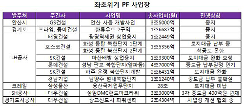 경기도가 1조7000억 원을 들여 킨텍스 부근에 조성키로 했던 한류우드, 3조5000억 원 규모의 안산사동개발은 이미 취소됐다. 부산북항 재개발, 대전엑스포공원 재개발, 광교지구 택지개발사업은 사업자를 구하지 못해 재공모 중이다. 업계에 따르면 현재 진행 중인 공모형 PF사업은 약 50여건이며 사업규모는 120조 원에 달한다.