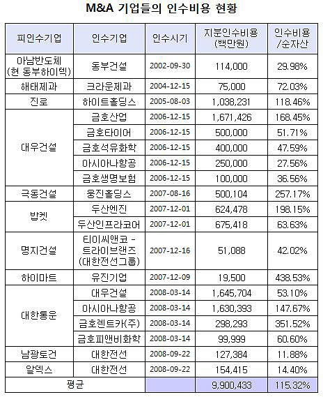 이런 부작용은 아남반도체를 인수한 동부건설, 해태제과를 사들인 크라운제과, 밥켓을 인수한 두산그룹 등에서도 나타났다. 경제개혁연대가 무리한 인수 후 후유증을 앓는 기업들을 조사한 결과에 따르면 이들이 기업 인수에 들인 순자산 대비 인수비용 평균은 115.32%에 달했다. 자기자본보다 더 많은 돈을 기업 인수에 퍼부었다가 후유증을 앓는 셈이다.
