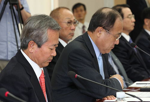 | ▲14일 열린 이사회에서 신상훈 신한금융지주 사장(왼쪽 첫 번째)이 굳은 표정으로 자리에 앉아 있다. 오른쪽 첫 번째 인물은 이백순 신한은행장). ⓒ뉴시스 |