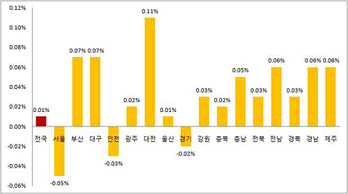 반면 수도권을 제외한 지역 땅값은 전월대비 0.05%포인트 상승해 대조를 이뤘다. 대구 달성군(0.23%), 대전 대덕구(0.16%) 등이 상대적으로 많이 올랐다.