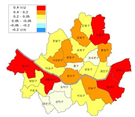 | ▲지난주 서울의 전셋값 변동 현황. 짙은색 지역일수록 상승률이 높다. ⓒ국민은행 |