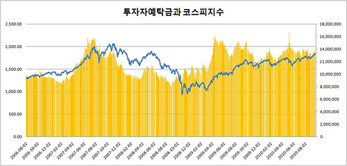 이날 금융투자협회에 따르면 2008년 금융위기 이후 8월 하순에는 8조 원대 초반까지 떨어졌던 투자자예탁금은 이후 서서히 증가해 24일 현재 13조6359억 원까지 늘어났다. 2006년 8월 이후 투자자예탁금이 13조 원대 전후를 꾸준히 기록한 시기는 코스피 강세가 절정에 달했던 지난 2007년 5월 말부터 8월 말, 작년 4월부터 6월 이후 이번 달이 유일하다.