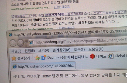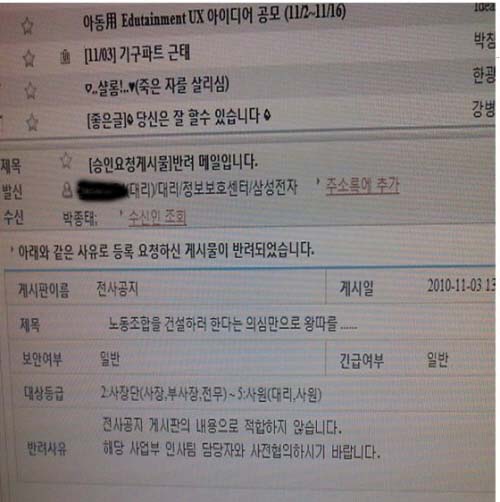 | 다음은 박종태 대리가 3일 삼성 사내 전산망에 올렸던 글 전문 - 노동조합을 건설하려 한다는 의심만으로 왕따근무 - 제조그룹에 근무 중인 1987년 입사한 "왕따사원' 박종태 대리입니다. 본인은 2007년 한가족협의회 위원에 출마하여 사원들의 직접선거로 당선된 이후 열과 성의를 다하여 현장사원들의 입장에서 불합리한 문제를 개선하고자 노력하였지만 2009년에 협의회에서는 면직을 당하였고, 해외출장을 보류해달라는 요청에도 회사로부터는 징계를 당해 인사고과에서 불이익을 받았고, 최근 왕따근무에 정신병동 입원 그리고 인사의 강제 발령으로 인하여 현재 정신과 및 신경과, 디스크 물리치료 약물치료 중에도 불구하고 제조그룹 메인에서 포장 작업을 하게 되었읍니다 협의회위원으로 사원들의 애로사항을 해결하고자 노력한 것은 상을 받을 일이지 협의회에서 면직당할 일은 아닐 것입니다. 회사의 지시라 하더라도 당사자의 처지와 의사를 존중해야 하는 것임에도 일방적으로 해외출장을 가지 않는 다하여 본인의 건강을 외면하고 징계를 내린 것은 부당한 처사가 아닐 수 없습니다. 그러다 보니 가족들 부양하며 먹고 살기위해 수모를 감수하면서 회사생활을 계속해야하는지 회의가 드는 때가 많아졌고 최근 본인에게 일어난 일들은 참으로 본인과 가족 모두에게 정신적으로 육체적으로 힘든 시간을 보내게 하고 있습니다. 내가 지금 당하고 있는 어려움은 결코 나만이 겪는 일은 아닐 것입니다. 아무리 힘이 없는 사원이긴 하지만 너무나 억울하여 삼성전자에 근무하시는 동료분들께 하소연이라도 하고자 글을 쓰게 되었습니다. 삼성전자 사원여러분 ! 본인은 협의회위원으로 활동하면서 더욱 더 현장사원들이 겪는 여러 어려움을 알게 되었습니다. 현장에서 일하다 다쳐도 해외출장 가서 사망해도 기혼 여사원이 장시간 노동강도에 유산을 해도 회사의 책임은 없고 본인의 과실만 강요하고 상사의 폭언에도 당연한 것처럼 받아들이는 기업문화는 정상적인 삼성전자의 경영방침은 아닐 것입니다. 당시'08년 ~'09년 2월 면직 전까지 사업부 대표로서(운영위원)소신과 철학을 바탕으로 저에게 투표권을 지지한 사원이든 지지 하지 않은 사원이든 차별 없이 대변 하기위해 최선을 다했다고 자부합니다. 그 중 제 임기 동안 구조조정이 없도록 지역구 협의위원과 협의하여 인사그룹장 이하 노사 담당과 12층 대회의실에서 임시회의를 요청 11기 임기동안 구조 조정이 없다는 인사그룹장의 답변과 임시 협의회 회의록을 문서로 남겼으며 당시 DM총괄 인사팀장께 협의위원 고과 기준관련 보다 투명하고 객관적 근거에 의하여 협의위원 평가 시스템을 보완 협의위원들이 사원의 의견을 떳떳하게 사측에 건의 하여도 협의위원 개개인에게 고과 평가에 영양이 없도록 사전에 협의위원 고과를 확정하여 임기동안은 C면 C, B면 B 일괄적으로 사전 평가를 2년 동안 고정등급으로 확정토록 제도적 마련이 시급하다고 건의를 했는데 팀장께서도 저의 건의에 동감을 한다고 했었습니다. 임산부 출산 후 하위고과에 따른 부작용과 이에 따른 퇴사권유와 압박 등을 일부 해결 했으며 일부 사원의 경우 타 사업장 전배관련 면담 호소관련 포함하여 사원의 입장이 제 입장이라고 생각하여 원활하게 가지 않도록 해결했습니다. 이런 정당한 위원활동이 노조를 건설하려는 의도를 가졌다하여 지금의 고통을 당하고 있다는 것은 어이없는 일이 아닙니까. 지난 23년간 삼성전자에 일하는 것을 커다란 자부심으로 일하여 왔고 앞으로도 그런 마음으로 살아가겠지만 이제는 더 이상 불이익을 감수하며 침묵하며 산다는 것은 나와 주위 동료들과 삼성전자의 발전에 도움이 안된다는 생각에 회사의 경직된 기업문화를 바꾸기 위해서는 법에 보장된 자주적이고 민주적인 노동조합을 건설하는 것이 삼성전자 사원들의 권리를 지키는 것이고 보다 인간다운 삶을 살아갈 수 있다는 결론에 도달하였습니다. 사원여러분들의 많은 관심과 격려를 부탁드립니다. |