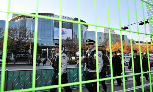 | ▲G20 서울 정상회의 개최를 하루 앞둔 10일 오후 정상회의장인 코엑스 앞에 방호벽이 설치된 가운데 경찰이 경계근무를 하고 있다. ⓒ뉴시스 |