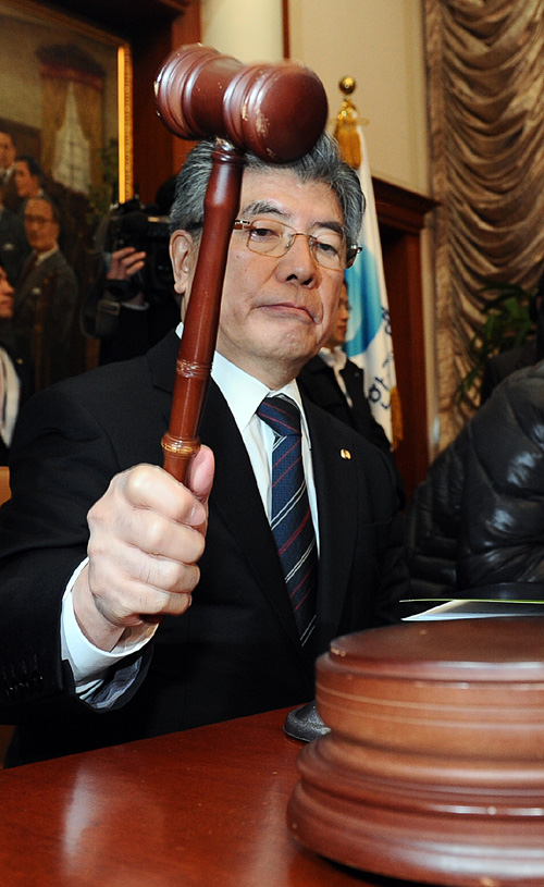 | ▲김중수 한국은행 총재가 16일 오전 한국은행에서 열린 금융통화위원회의에 참석, 회의 시작을 알리는 의사봉을 두드리고 있다. ⓒ뉴시스 |