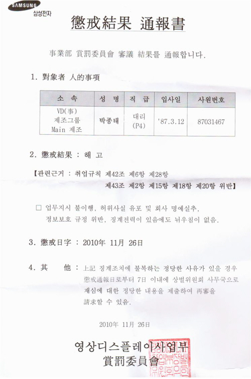 | ▲ 삼성전자가 박종태 대리에게 보낸 징계결과 통보서. |