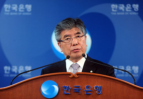 | ▲김중수 한국은행 총재가 9일 오전 서울 남대문로 한국은행 본점에서 기준금리 동결 배경에 대한 설명을 하고 있다. 김 총재는 한은의 독립성 논란이 한창인 와중에 한은 수장으로 취임했다. 이명박 대통령과 친분이 있다는 점 때문에 금융권에서는 한은이 정부 기조를 따르게 될 것이라는 전망이 많았다. ⓒ뉴시스 |