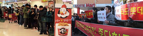 | ▲롯데마트의 통큰치킨 판매를 계기로 그 동안 상대적으로 거론되지 않던 소비자 권리가 여론의 중심에서 강하게 부각되고 있다. 그러나 롯데마트의 저가상품 판매는 결국 상권 장악을 목표로 했다는 점과 자영업자에게 피해를 입힌다는 점에서 무조건적인 선의로 받아들이기는 곤란하다는 입장도 많다. ⓒ연합 |