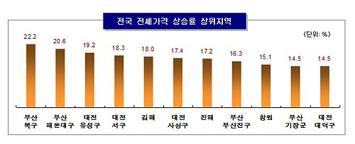 6대 광역시는 무려 8.4% 올라 전국 평균을 웃돌았다. 특히 부산과 대전은 각각 13.7%, 15.0% 상승해 광역시 평균 상승률에 비해서도 두 배 가까운 오름세를 보였다. 부산 북구(22.2%), 부산 해운대구(20.6%), 대전 유성구(19.2%) 등은 재개발·재건축 수요와 맞물리면서 전세값이 급등, 수요자들에 큰 부담을 안겼다.