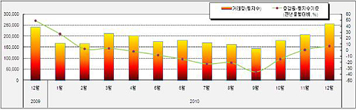 | ▲월별토지거래량(필지수 기준). 지난해 하반기 들어 서서히 거래량이 늘어나고 있다. ⓒ프레시안 |