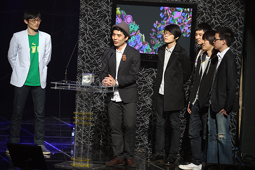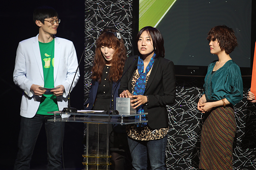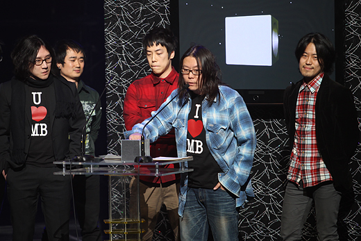 | ▲올해의 신인과 최우수 록 노래 부문을 수상한 게이트 플라워즈. 이날 박근홍(보컬, 오른쪽에서 두 번째)과 염승식(기타, 왼쪽 첫 번째)은 'I♡NY'을 패러디한 'I♡MB'란 글자가 프린트된 티셔츠를 입고 나와 객석에 웃음을 선사했다. ⓒ프레시안(최형락) |