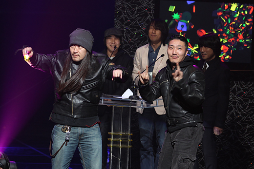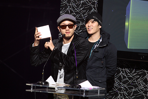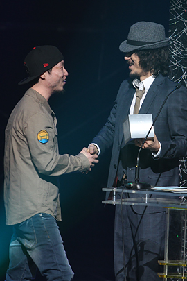 | ▲최우수 랩&힙합 음반 수상을 하는 가리온의 MC메타(왼쪽)와 시상자 타이거JK(오른쪽). MC메타는 힙합신의 중요한 레이블로 평가되는 소울컴퍼니 발족에 큰 영향을 미쳤다. ⓒ프레시안(최형락) |