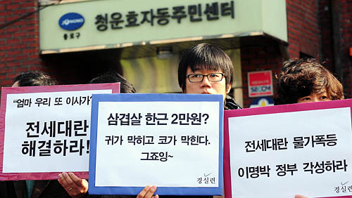 | ▲전세문제는 앙등하는 물가문제와 맞물리면서, 한국 사회 최대 이슈가 됐다. 지난달 24일 오전 서울 종로구 청운동사무소 앞에서 경제정의실천시민연합 회원들이 전세난 해소를 촉구하는 기자회견을 열었다. ⓒ뉴시스 |