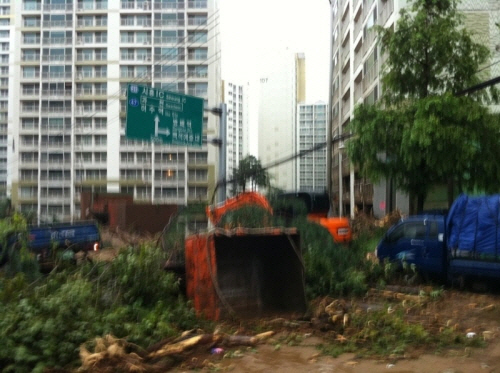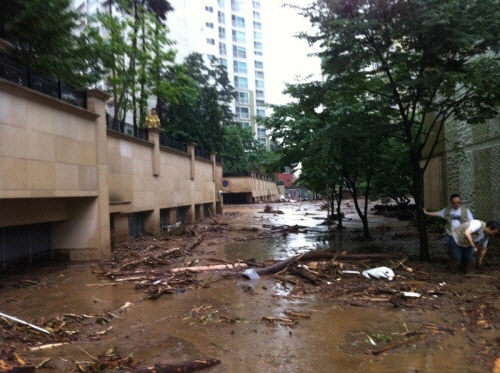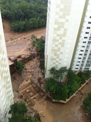 | ▲ 서울시 서초구에 있는 우면산이 무너지면서, 토사와 나무가 인근 아파트 단지를 덮쳤다. ⓒ프레시안(선명수) |