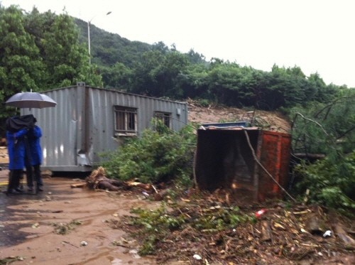 | ▲ 산위에 있던 컨테이너와 공사 장비가 토사에 휩쓸려 남부순환로로 내려왔다. ⓒ프레시안(선명수) |