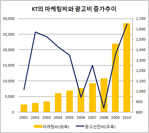 정종남 투기자본감시센터 기획국장이 KT감사보고서를 근거로 지난 6월 발표한 자료를 보면, 지난 2001년 KT의 마케팅비와 광고선전비는 각각 2478억 원, 1016억 원이었으며, 이는 지난해 들어 2조8501억 원, 1644억 원으로 급증했다. 마케팅비의 경우 증가율이 무려 1050%에 달한다. 마케팅은 분명 기업 '경영'에 중요한 요소이지만, 이는 설비투자와 기술개발이 필요한 KT와 같은 업체의 핵심역량과는 아무런 관계가 없다. 민영화는 KT의 경쟁력을 높이는데 실패했다.
