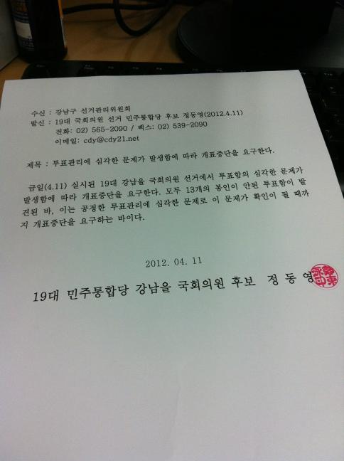 민주통합당 정동영 후보측 개표 참관인이 미봉인 투표함을 발견하면서 개표가 일시 중단됐고 여야 참관인들 사이에서 고성이 오갔다. 정 후보 측 정책비서인 황유정 씨는 "심지어 대치2동 제1투표소 투표함은 자물쇠가 잠겨있지도 않았다"며 유효투표에서 제외할 것을 요구했다.