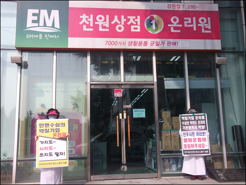 | ▲ 용역업체 온리원은 대학 청소노동자와는 전혀 상관 없는 전국 30여 곳의 천원상점 판매직노조가 다수파라는 이유로 청소노동자들과의 교섭에 불성실하게 응하고 있다. 사진은 전주오거리 부근에 위치한 천원상점 온리원 매장 앞에서 일인시위 중인 전주대·비전대 청소노동자들. ⓒ연정 |