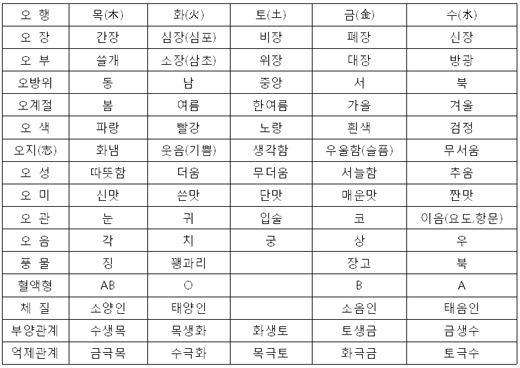 | ▲ 오행 상응 일람표. 상대적 경향성을 나타낸 것일 뿐 절대적인 기준은 아님 |