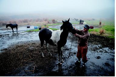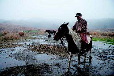 | ▲ 김완보 씨가 중산간의 비가 퍼붓는 목장에서 말을 돌보고 있다. 말테우리는 오랜 세월에 걸쳐 체득한 지식체계가 있다. 이재수(1901년 제주민란 주동)도 말테우리였다고 한다. ⓒ 안홍범 |