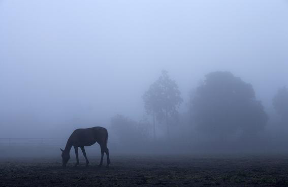 | ▲ 제주도 중산간의 말. 안개 낀 한라산에선 방목하던 말을 잃어버리기도 하니 말테우리는 이를 찾느라고 고생고생 헤맨다. ⓒ 안홍범 |