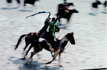 | ▲ 몽고인 남녀기수들이 말 등자만 딛고 서서 질주하고 있다. ⓒ 안홍범 |