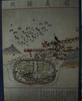 | ▲ 이형상의 「탐라순력도」중 1702년 11월2일(음력) 정의현성에서 조련과 제반사항을 점검하는 '정의조점' 부분. (김남길 그림) |