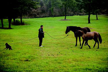 | ▲ 저지리 목장에서 경주마를 돌보는 고경현씨. 날뛰는 말에 밧줄을 걸어 잡는 것이 특기라고 한다. 제주개 한 마리가 말과 함께 목장에서 뛰어 다니다가 자동차 뒤를 따라 차도에서도 한참이나 쫒아오더니 다시 목장으로 돌아갔다. ⓒ 안홍범 |