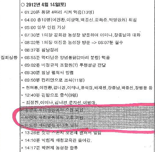 문건에는 '1시20분 통닭 4마리 시켜먹음(13명), 8시37분 침낭정리' 등 기상시간부터 잠들 때까지 조합원들의 집회 동향이 세세히 적혀있을 뿐만 아니라, 심지어 노조 간부들의 병원 입퇴원 기록도 있었다. 현대차 보안팀이 통상적인 업무 범위를 벗어나 공장 밖에서까지 비정규직 노동자들의 동태를 파악했음을 보여준다.