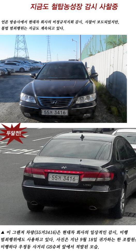 | ▲ 비정규직노조가 '미행'의 근거로 제시한 사측의 그랜저 차량 사진. ⓒ현대차비정규직지회 |