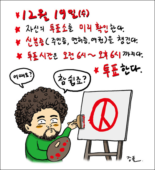 웹툰작가 강풀 씨는 "많은 분들이 자동차 뒤 유리창에 붙일 투표하자툰을 요청하셨었죠. 인쇄해서 안쪽에다 붙이시면 됩니다. 난 몰라. 펌질, 인쇄, 알티 무한 가능"이라며 투표 독려 카툰을 올렸다.