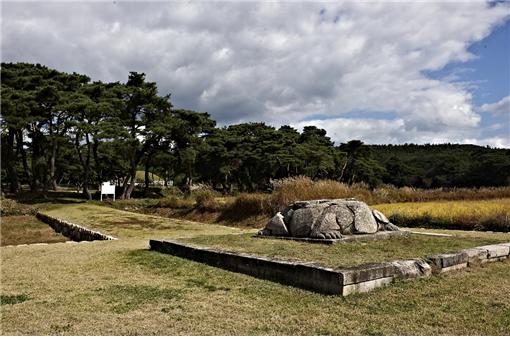 | ▲ 성덕왕릉이 있는 양장곡 분지의 돌거북. 거대한 조각의 머리는 깨어지고 비석도 사라진 채 논벌 한가운데서 능역을 지킨다. ⓒ 이순희 |