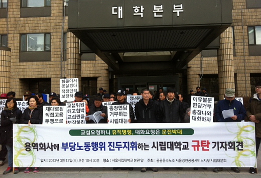 서울시는 지난해 12월 '공공부문 비정규직 정규직 전환 대책'을 발표하고, 2014년 1월 1일까지 서울시립대에서 일하는 시설 노동자들을 정규직으로 전환키로 했다. 그러나 학교 측과 용역업체의 계약이 오는 7월 종료될 예정이어서 노동자들은 고용 불안에 시달리고 있다.