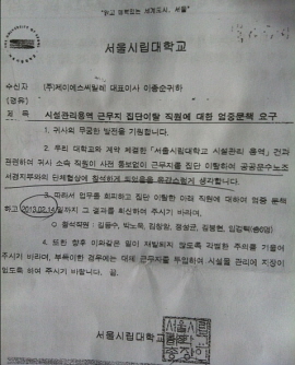 | ▲ 서울시립대 총장이 '시설관리용역 근무지 집단 이탈 직원에 대한 엄중 문책 요구'라는 제목으로 시설 관리 용역업체 측에 보낸 공문. ⓒ프레시안(김윤나영) |