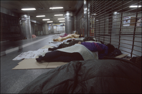 | ▲ IMF 구제 금융 위기 이후 실업 사태가 본격화하면서 거리로 내몰린 실직자들이 낮이면 일자리를 찾아 헤매다 사회 단체들이 제공하는 무료 급식으로 주린 배를 채우고 밤이 되면 지하철 통로에 노숙을 하고 있다(1998년 6월 22일). ⓒ연합뉴스 |