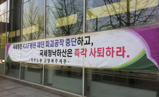 정 분회장은 "홍준표 도지사가 수익성 논리로 공공 병원인 진주의료원의 폐업을 발표했듯이, 국세청과 주류업계가 공익 재단이 운영하는 카프 병원을 무력화하고 있다"고 비판했다.