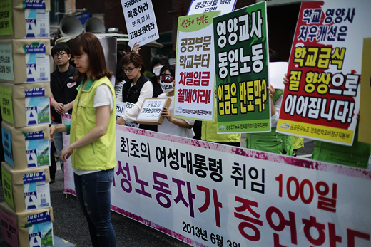 여성 노동자들은 저임금·불안정 일자리에 내몰려 있다고 호소하며 특히 박근혜 대통령의 '시간제 일자리' 발언을 비판했다.