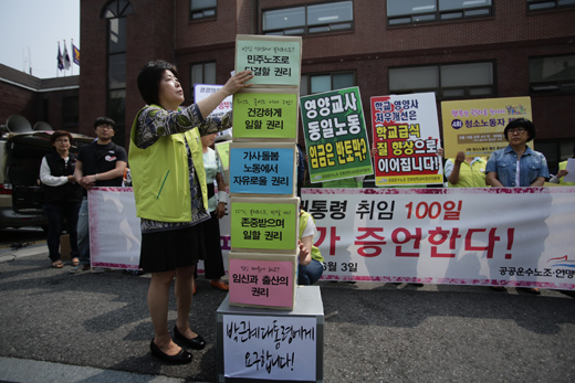 정인용 공공운수노조 학교비정규직본부 경기지부 사무국장은 "박근혜 대통령이 여성을 중심으로 '시간제 일자리'를 늘려야 한다고 말한 이후로, 학교에서 비정규직 노동자들에게 주 15시간 이하 근무를 강요하고 있다"며 "부산에서 아이들을 돌보는 방과 후 코디들은 '시간제'를 거부하면 대량 해고됐다"고 비판했다.