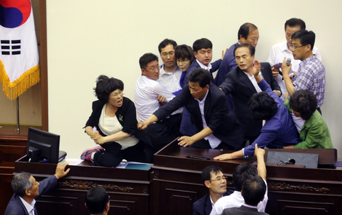 | ▲ 김오영 경남도의회 의장(맨 뒤)이 11일 오후 도의회 본회의장에서 동료 새누리당 의원과 의회 사무처 직원의 보호 속에 진주의료원 해산 조례를 날치기 통과하려 하자 민주개혁연대 소속 도의원들이 저지하기 위해 단상으로 달려들고 있다. ⓒ연합뉴스 |