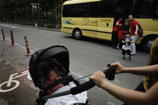 | ▲ 나 씨가 우는 아이를 달래러 아이를 데리고 산책하고 있다. 뒤로 어린이집 차량이 보인다. 나 씨는 "아파트 할머니들이 어린이집에서 4, 5시면 유모차를 끌고 놀이터네 집결한다"고 말했다. ⓒ프레시안(최형락) |