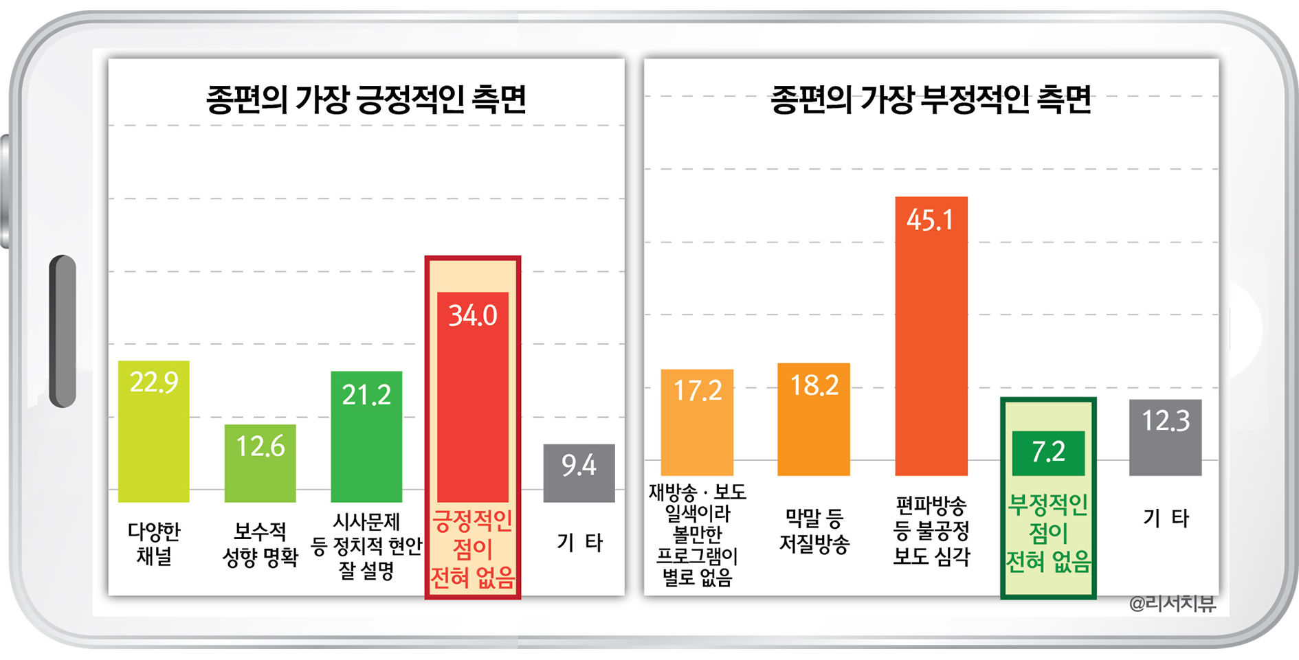 조사 결과 응답자들은 종편의 긍정적인 측면으로 '다양한 채널'(22.9%)을 꼽았다. '시사 문제를 잘 설명한다'는 답도 21.2%를 차지했으며 '보수적인 성향이 명확하다'는 대답도 12.6%였다. 종편의 부정적인 측면으로는 '편파 방송'이 45.1%로 1위를 차지했고, 그 뒤를 '막말 저질 방송'(18.2%), '획일적 프로그램'(17.2%) 등이 이었다. 부정적인 응답들은 종편 채널이 외연 확장을 위해 안고 가야 할 숙제로 남은 셈이다.