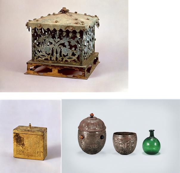 | ▲ 석가탑 사리유물중 (위 왼쪽부터) 금동사리외함, 금동사리외합, 은제와 파리제(유리) 병으로 이뤄진 사리장엄구들. 경건함과 함께 귀하고 화려하게 만들어 받드는 종교적 심성이 느껴진다. ⓒ 문화재청 |