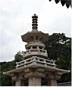 | ▲ 목조건축 기법을 그대로 돌로 실현시킨듯한 다보탑의 상층부는 팔각과 원형의 디자인이 겹겹이 중첩된다. 옥개석과 그 위에 설치된 돌난간의 비율이 참으로 아름답다. ⓒ 이순희 |