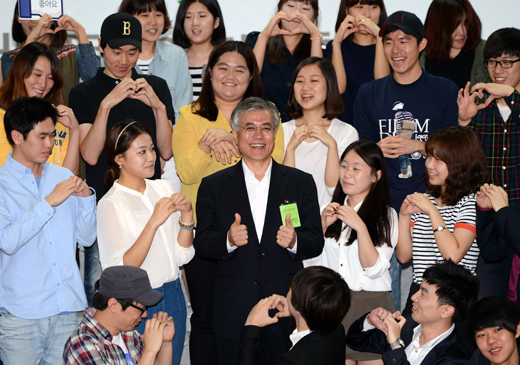 | ▲ 민주통합당 문재인 대통령 후보가 7일 오후 서울 광진구 광진구청에서 열린 '수험번호1219, 문재인을 면접하라' 청년들과의 타운홀미팅에 참석해 청년들에게 사랑의 하트를 받고 있다. ⓒ뉴시스 |