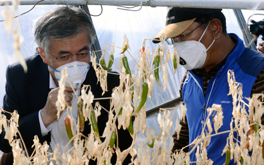 | ▲ 민주통합당 문재인 대선 후보가 7일 오전 불산가스 유출사고 피해를 입은 경북 구미시 산동면 봉산리를 찾아 말라죽은 비닐하우스 고추를 살펴보고 있다. ⓒ뉴시스 |